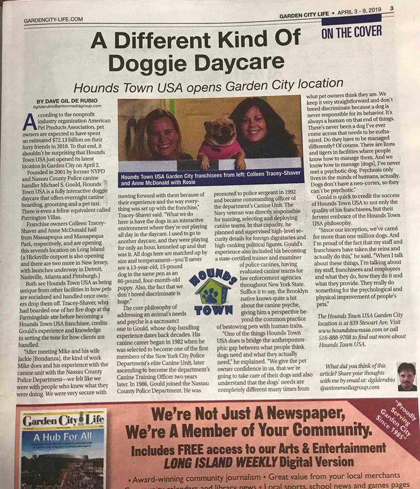 Hounds Town – Garden City is officially open and on the cover of this week’s Garden City Life! Located at 839 Stewart Avenue in Garden City, the popular doggie day care offers something different to dog owners. “I used to go to another daycare, and they were playing for only an hour, kenneled up, and that was it,” say franchisee owner Colleen Tracey-Shaver. But at Hounds Town USA, it’s different. Dogs are grouped by size, personality, and temperament, and they interact with each other all day long.